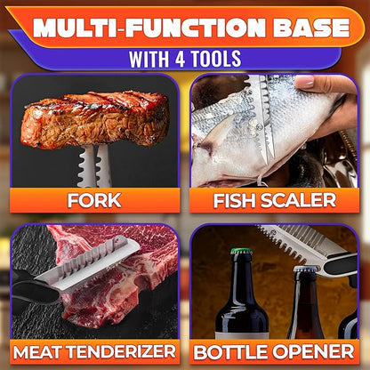 This shear is a kitchen "jack-of-all-trades"it cuts veggies/meat, plus it has a built-in bottle opener(opens beers/spice jars easily), fish scaler (no messyhands when prepping seafood), bone cutter (chops chickenwings/ribs without a cleaver), and even opens cans/twistslids. 7 functions in one tool-no more rummaging fordifferent aadaets, cuttina vour prep time in half.
